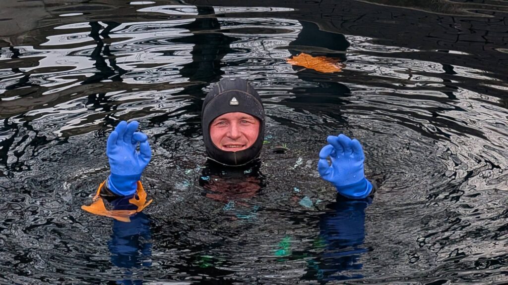 In total nine people decided to dive (with a total of 19 for the meal). We entered via the connecting canal and headed out in two shifts diving in a clockwise direction. Visibility was about 4/6 meters and maximum depths were 8m. The loch served up a selection of life including 11 bikes, a row boat, a couple of electric scooters, one lap top, bollards, fences and the occasional fish.